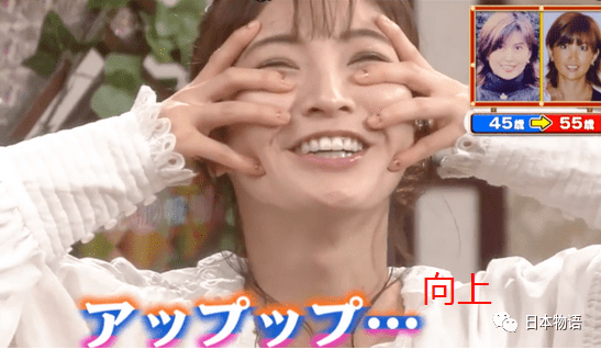 其中,潤子奶奶的免費美容竅門就是臉部按摩術,三個手指分別按住眉骨、顴骨和法令紋,展開肩胛骨,手指往上提連續說6次「向上」。