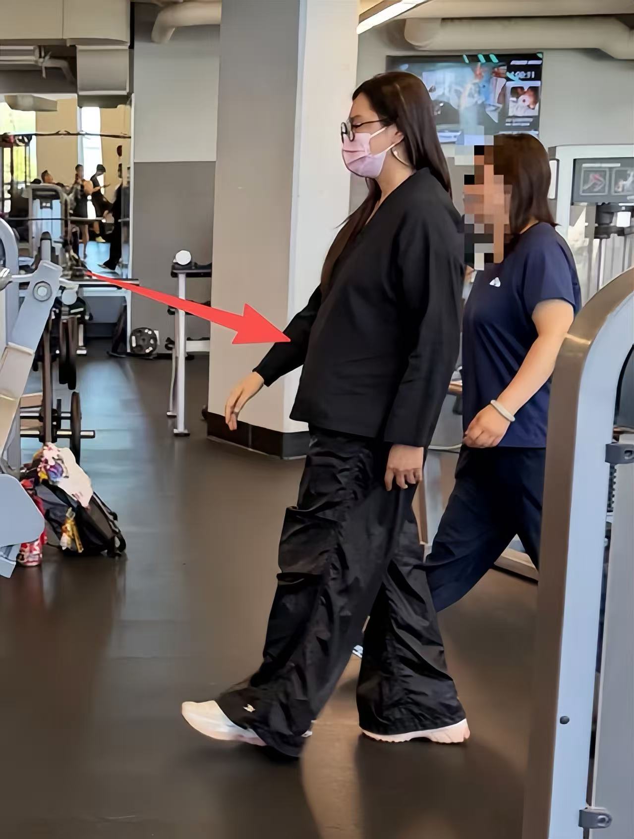 健身房的工作人員帶著王祖賢閑逛,從側面看她的肚子真不是一般大,將特別寬鬆的衣服都撐起來,這肚大如籮的確實該減肥了。