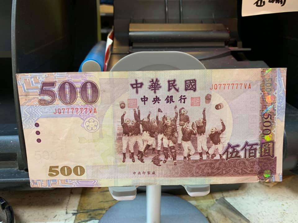 根據《東森新聞網》報導,一名女網友在臉書「爆怨公社」中分享,表示自己拿到了一張500元的紙鈔,但是在收進錢包之前,意外發現右上角的編號竟然是罕見的「6連號」。而從她PO上網的照片中可以看到,鈔票上確實印著「JQ777777VA」,讓她頓時超興奮,忍不住驚嘆「真的是百年難得一見!」她隨後還透露,這張鈔票是客人拿來買東西的,剛拿到時她還不敢相信,害怕是假鈔,幸好放進點鈔機後,證實了是一張真鈔。