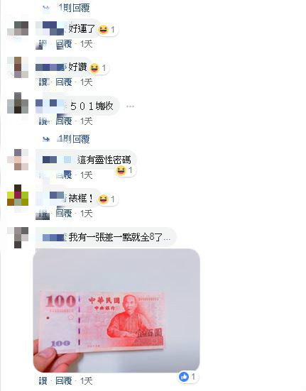 而如今這則貼文,已經在網路上掀起了一陣熱議,有很多人也趁機分享自己收藏的鈔票,表示「我有這一張編號是012345的欸!」、「我有一張差一點就全8了,有點可惜,但我還是收藏起來了 XD」、「我有一張157777的100元鈔票,這樣有保值嗎?」、「我的是2000元鈔票,568888」。