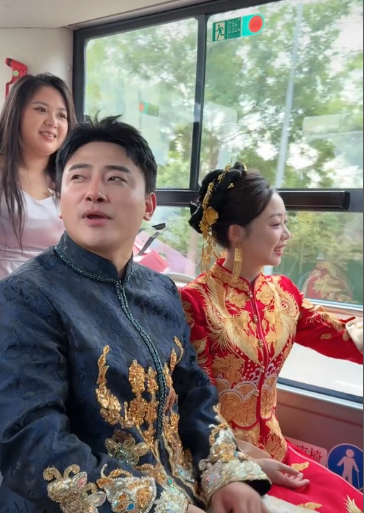 夫妻二人穿著中式禮服、坐在公車上,齊如意老公嘴角的笑意、藏都藏不住,甚至在車上開心哼起歌,顯然是一副成功將老婆娶到手的開心和興奮!作為新娘的齊如意,臉上的笑容也沒有停過,隔著螢幕都能感覺到、他們倆非常相愛,滿眼滿心都是對方。