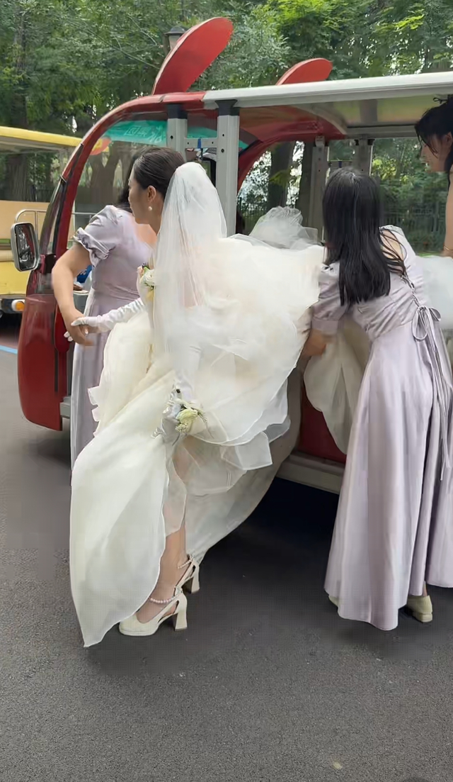 隨後,夫妻二人前往森林公園、舉辦戶外婚禮,齊如意換上了潔白婚紗,整個人溫婉又美麗,這對新人手牽手走在公園裡,齊如意老公全程仔細陪伴在側。老實說,前幾天才入伏,河北邢台的戶外已有30多度,齊如意穿著厚重的婚紗,腳踩著高跟鞋、熱得直喘氣。