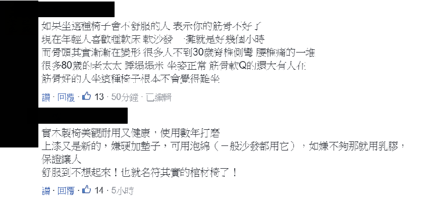 有網友表示,這種椅子其實,「真的是符合人體工學,只是很多人筋骨歪掉,坐了才會不舒服」、「現代人都坐慣了軟綿綿的沙發,加上長期姿勢不良,才會覺得這個椅子不好用」、「姿勢正確、脊椎沒受傷的人坐上去,其實超舒服的」、「重點是便宜又CP值高,木頭也沒那麼容易壞掉啊!」