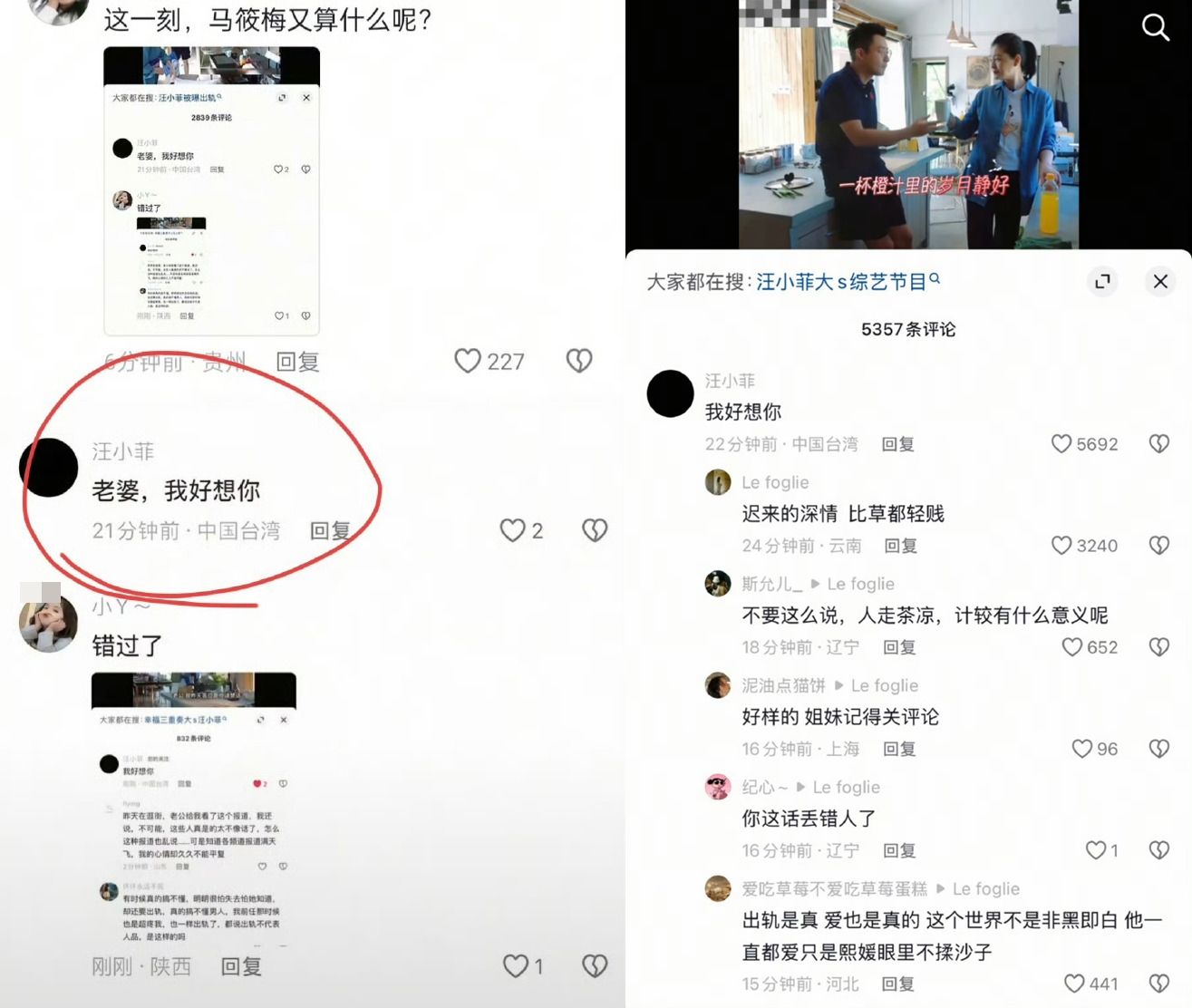 而今日(2/4)又傳出汪小菲真情流露卻引來爭議的小動作,根據《ettoday新聞雲》報導,有眼尖網友發現,4日他在先前與大S合作的綜藝節目《幸福三重奏》影片下方留言:「老婆,我好想你」,雖然很快就刪除「老婆」兩字,只留下「我好想你」四字,但仍立刻被網友截圖並引發熱議。