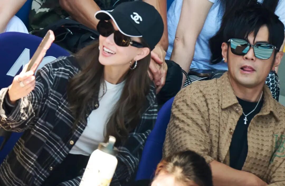 周杰倫和昆凌的穿搭一看就是來「輕鬆看球」的:帽子、墨鏡、休閑襯衫,沒走紅毯那套,但細節又很講究。兩個人坐著不吵不鬧,眼睛盯著場內,偶爾轉頭跟朋友聊兩句,嘴角帶笑,那種「真粉絲來打卡」的狀態很明顯。