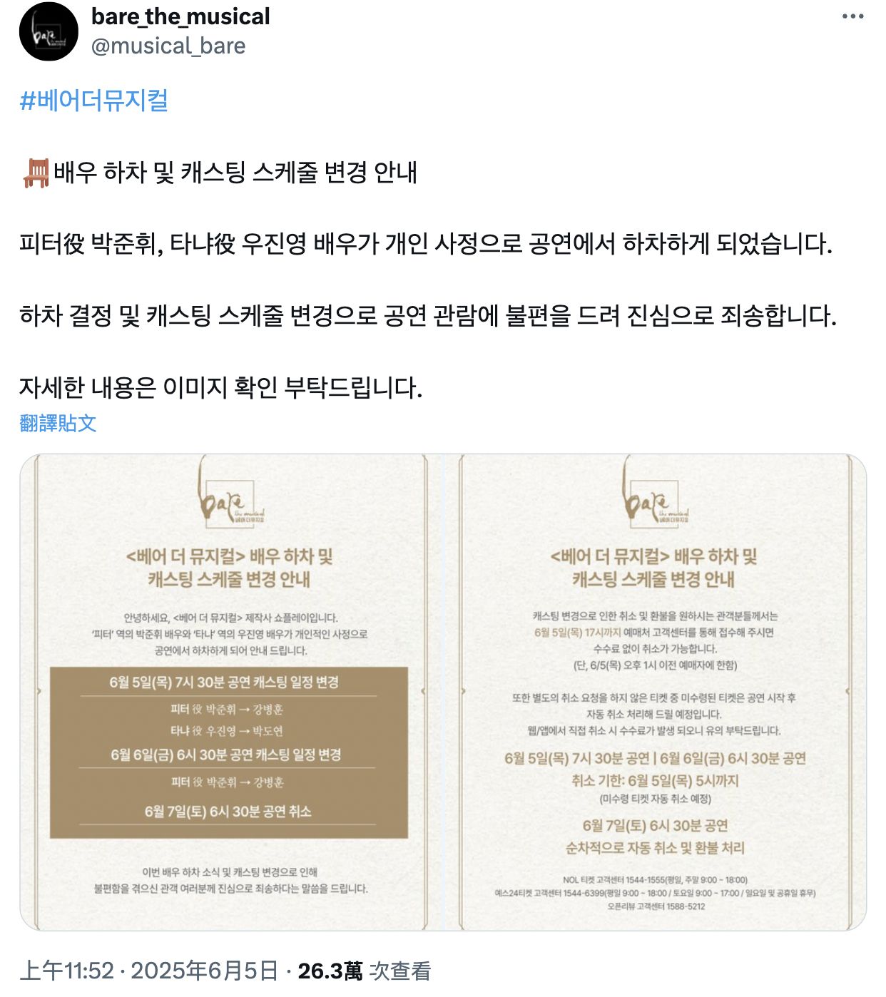 事件爆發後,朴竣輝立即關閉了個人Instagram帳號,並緊急退出目前正在演出的音樂劇,但並未說明原因。同樣捲入風波的小三演員也跟著宣布退出演出,韓國音樂劇界為此事件掀起軒然大波,網路論壇更出現「晚上音樂劇界出大事的原因」等討論串,引發廣大網友熱議。