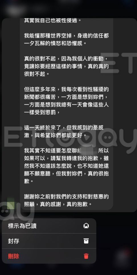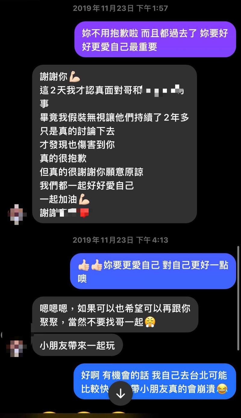 蕾媽親自傳訊息,得到對方的原諒,也表示今後一定要「一起好好愛自己」,只是事件並沒有結束,近期爆料曝光後,Z女馬上收到宥勝私訊,寫著:「其實我自己也被性侵過。我能懂那種世界空掉,身邊的信任都一夕瓦解的憤怒和恐懼感。真的很對不起,因為我個人的衝動,竟讓妳要經歷這樣的事情!」只是宥勝又強調,這麼多年來,每次看到性騷擾的新聞都很痛苦,希望這些犯人可以受到懲處,但如今卻在事件爆發後才出面發聲,一番話讓人看得一頭霧水。