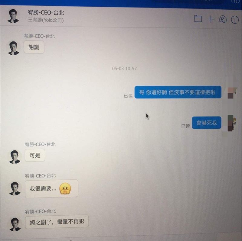 據《ETtoday》報導,一名Z女出面爆料自己遭宥勝無預警環抱,另一名H女也遭到宥勝性騷擾,而從公開的私訊對話中可以看到,蕾媽在2019年的11月,傳訊息給她:「對不起,我今天才知道哥做了對不起妳的事,真的很抱歉!」老公出事要讓老婆道歉,已經讓人傻眼,更誇張的是,蕾媽接著說,會發現這件事情,主要是知道宥勝外遇,自責地說:「我假裝無視,讓他們持續了2年多...」直到最後攤牌,才知道有女員工遭到性騷擾。