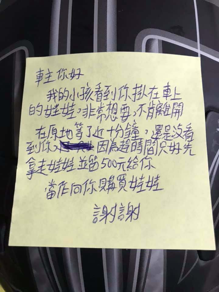 後來原PO也補充後續,表示去停車場管理處調閱監視器,畫面中有拍到拿走的人,是對年輕夫妻和約四五歲的小男孩,孩子當時在車子旁邊看娃娃許久,爸媽嘗試跟孩子溝通卻還是沒有用,最後只好留下紙條和鈔票,但因為鈔票沒夾緊掉落地上,後來才被其他人撿走。