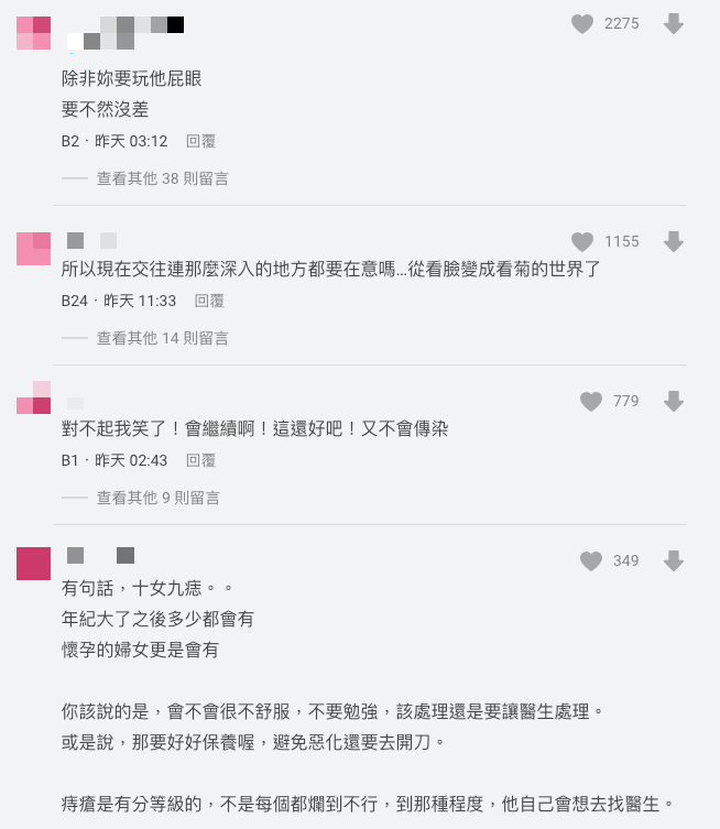 許多網友看到後,紛紛幽默回覆,「除非妳要玩他屁X,要不然沒差」、「現在交往連那麼深入的地方都要在意嗎…從看臉變成看菊的世界了」、「看來是以大菊為重」。但也有網友認真表示,原PO會有這樣的心態,並不是真的喜歡,「如果你覺得沒辦法接受或者因為這樣減少對他的好感,結論就是你只是暈船並沒有喜歡」、「若你真的喜歡他,不會在意這些的」、「區區一個痔瘡都過不去就放棄吧,至少他很坦白。真的喜歡他的話,你應該看看什麼方法能幫他減緩不適」。