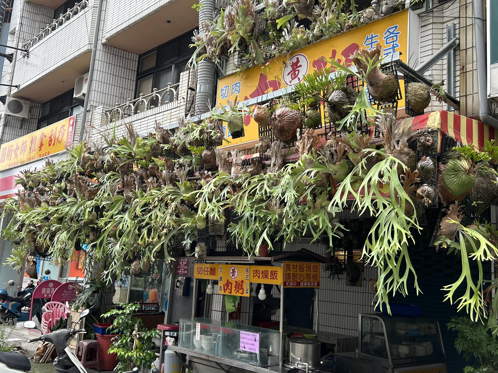 一名網友就在臉書社團「路上觀察學院」PO出一張照片,畫面中是一間販賣切仔麵、肉粥、肉燥飯的小吃店,二樓陽台牆壁掛著黃色招牌,不過仔細一看卻發現招牌相當與眾不同,因為一樓帆布屋頂和二樓陽台都種了滿滿的鹿角蕨!