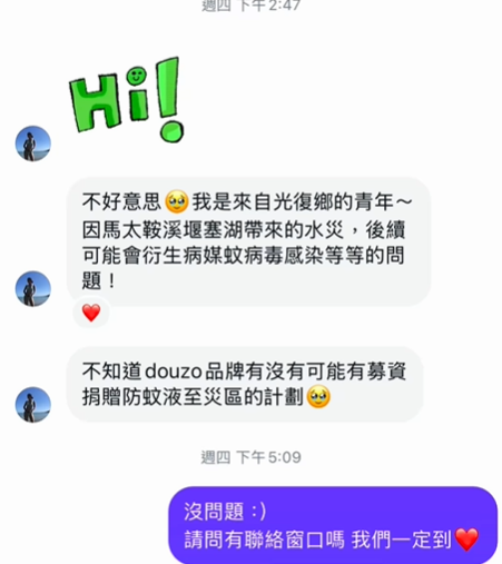 根據《ETtoday星光雲》、《東森娛樂》報導,一名光復鄉青年透過私訊表示,災後可能衍生病媒蚊、病毒感染等問題,希望能夠募資捐贈防蚊液。面對災民的請求,竇智孔二話不說便承諾會親自送達,「沒問題,我們一定到。」