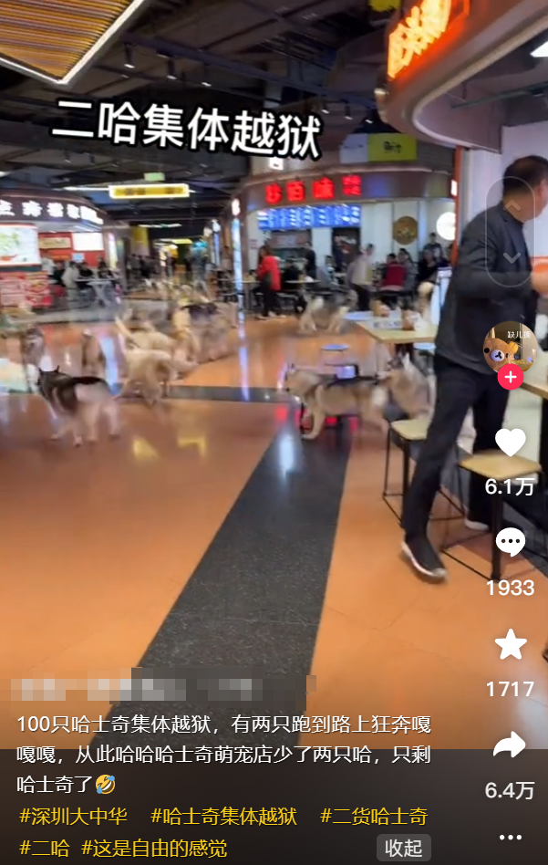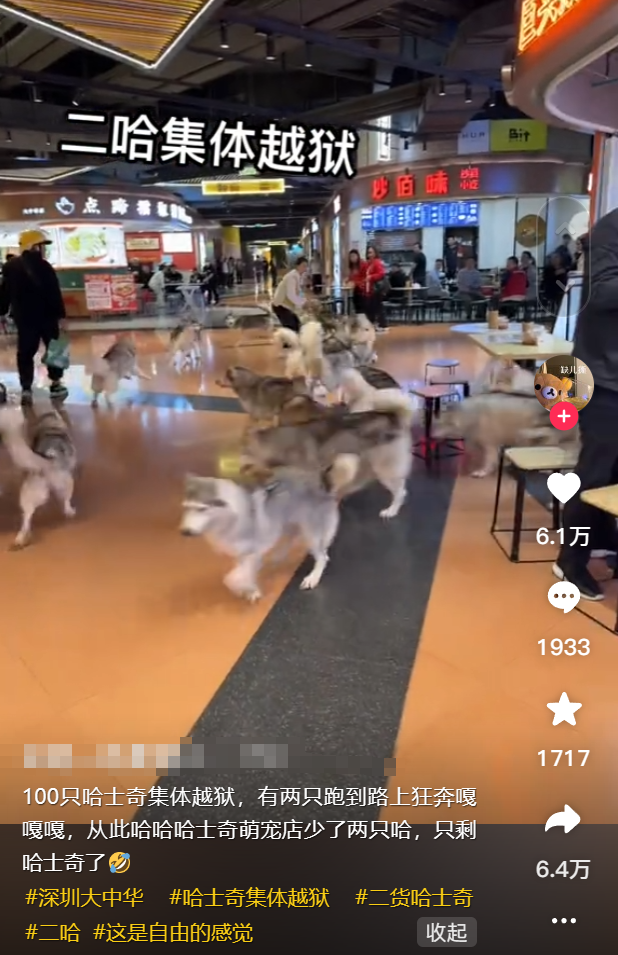 誰也沒料到,一名不明就裡的顧客竟然不小心將店門打開,瞬間就讓這群二哈嘗到了「自由的滋味。影片中可看到,隻見一大群哈士奇竄出店門,有的直接朝商城的各個角落狂奔,有的則蜂擁到旁邊的一家餐廳,嚇壞了正在就餐的顧客。