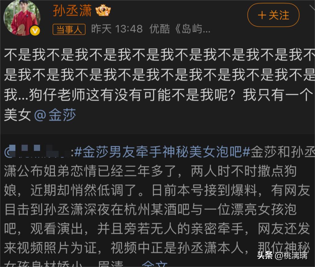 僅僅過去幾小時,孫丞瀟立刻轉發爆料人的內容,並配文道「不是我不是我不是我,狗仔老師有沒有可能認錯人了,我只有一個美女金莎。」
