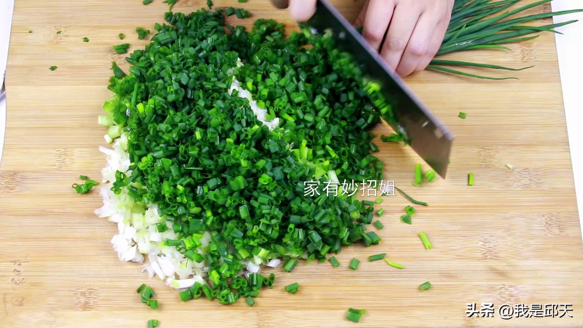 水分晾乾後,我們把香蔥收起來放在案板上,然後將根須切掉不要,剩下的蔥白和蔥綠按照平時使用的大小,都切成小段的。在切香蔥的過程中,氣味會比較嗆鼻,我們可以在切之前先戴個口罩,就能避免這個問題了。