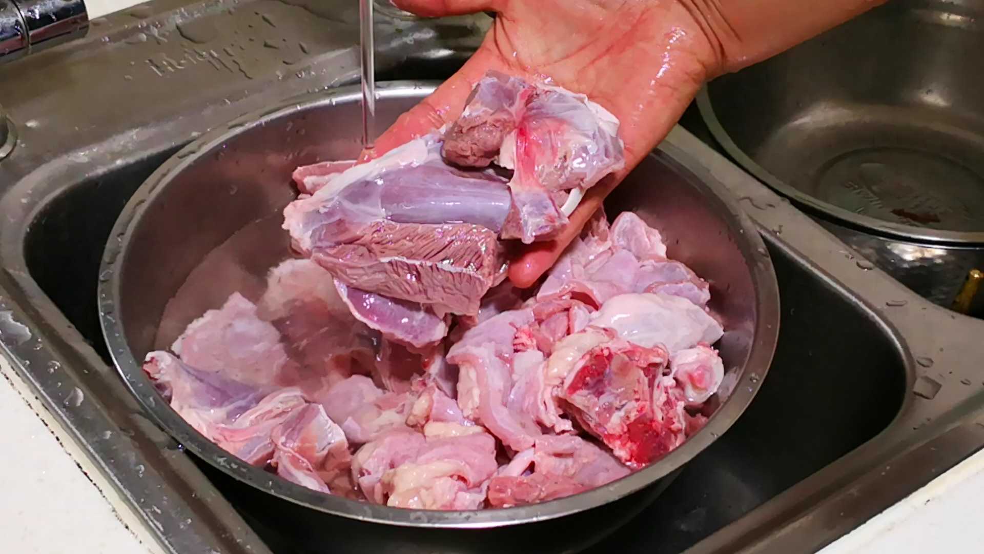 1、首先,我們需要準備上一些排骨,五指毛桃,紅棗和枸杞,準備好了以後,我們先來處理一下排骨,將其排骨放在一個盆中,然後放入排骨,在加入適量的麵粉和一勺食用鹽,下手將其排骨裡面的搓洗乾淨,因為麵粉可以吸附出雜質和灰塵,食用鹽可以將其血水沖洗出來,所以,在這裡排骨一定要清洗乾淨,然後我們在流動的清水下,沖洗幾次,一直將排骨的表面血水沖洗乾淨就可以了。