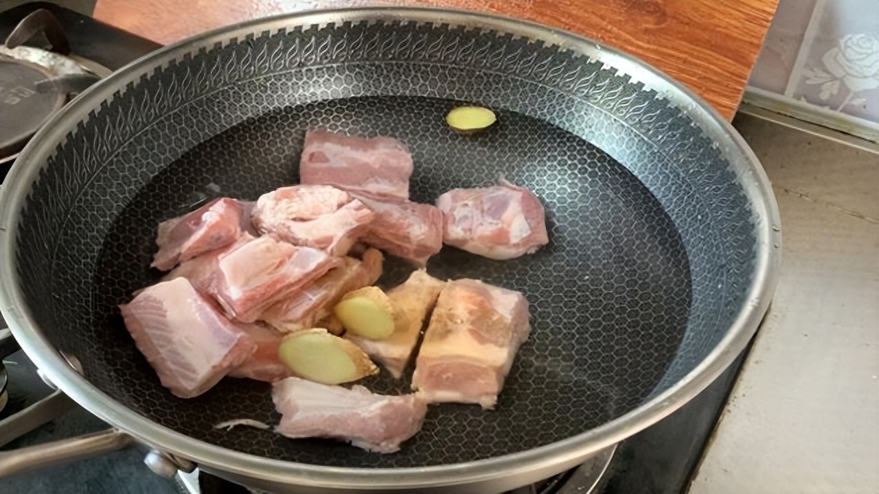 2、清洗好的排骨,這個時候我們就要起鍋燒水,首先我們先把排骨放入鍋中,在往鍋中倒入沒過排骨的清水,在倒入料酒和蔥薑片,去去腥味,然後開啟中大火,將其水煮至沸騰后,我們下入勺子攪拌焯水一會,我們的排骨就可以撈出了。但是注意,焯水的浮沫粘在排骨上的話,我們就要過一次清水,這樣有腥味的浮沫就不會帶入到我們湯中了。