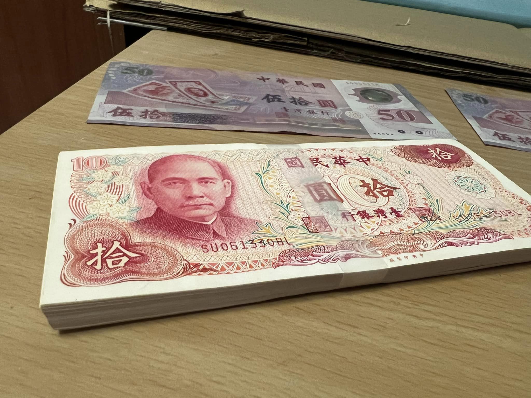 PO在臉書社團《爆廢1公社》貼出一張照片,照片中可見,桌椅上擺著許多舊鈔票,面額包括10元、50元、100元的舊鈔票,雖然說這些鈔票放置數十年,但依舊看起來非常地新,保存狀況良好。