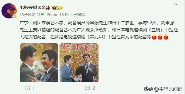據電影人余泳稱,知名表演藝術家、一級演員、知名配音人士簡肇強不幸因病去世,享耆壽92歲,雖說這個年紀屬於「喜喪」,但對於他這樣有才的人來說,未免有些太可惜,以至於很多粉絲無法接受,尤其是40歲左右的網友。