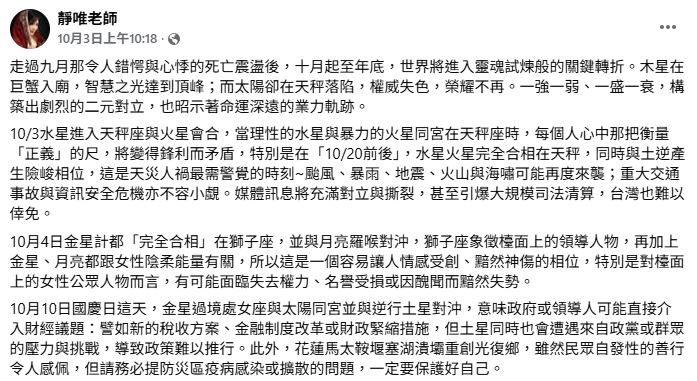 根據臉書命理專家分析,進入十月後至年底期間,全球將進入關鍵性的轉折階段。特別是在國慶日當天,金星將過境處女座並與太陽形成同宮,同時與逆行的土星呈現對沖狀態,這樣的星象組合相當特殊。雖然花蓮災區已見到許多暖心善舉,但仍需密切關注疫病感染擴散的可能性。