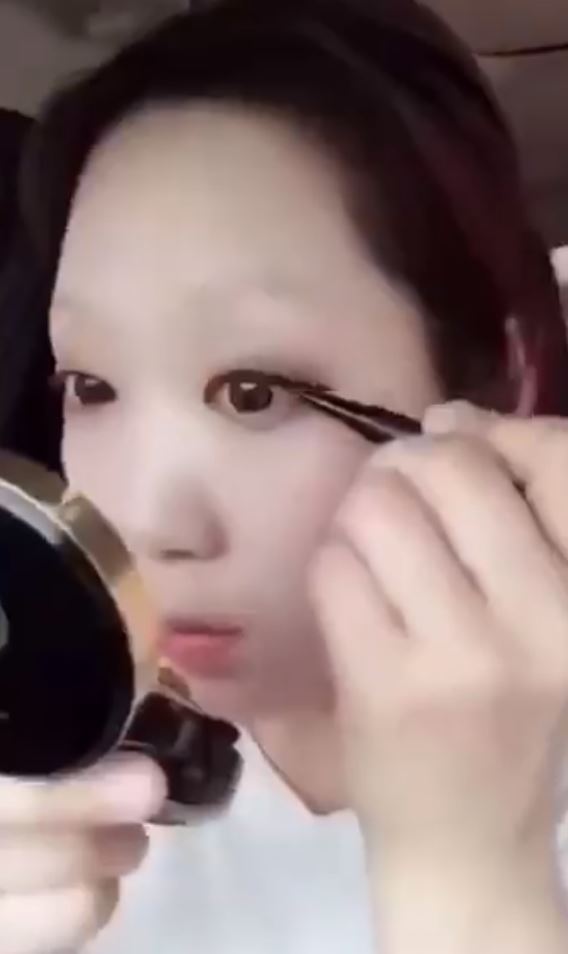 光是上底妝當然還不夠,眼妝的部分同樣也是很重要的!!她先是在眼睛周圍塗上眼影,再來就拿出眼線筆小心翼翼地畫出眼線。