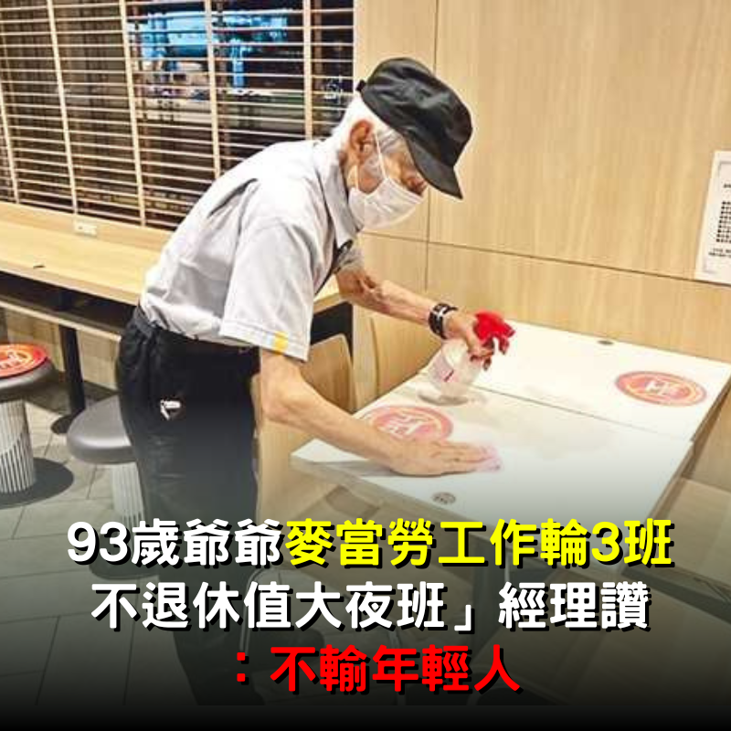 活到老動到老!93歲老爺爺「麥當勞工作輪3班」 努力不退休「值大夜班也OK」經理讚:不輸年輕人