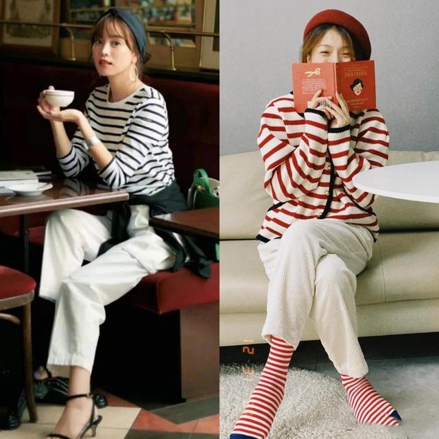 單調的純色打底衫真的有點顯老氣了,推薦大家嘗試條紋元素的打底衫,比如紅白條紋或黑白條紋,這種經典的配色怎麼穿都不會出錯。