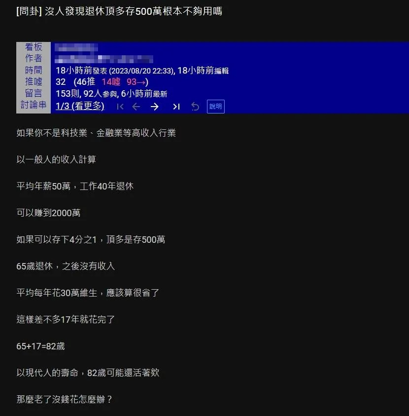 原PO繼續表示,65歲退休沒收入來源後,如果很省著花、一年也至少要30萬維生,那500萬退休金差不多17年就花光了,那時候也才82歲!原PO驚呼,以現代人的壽命來看,82歲很可能還活著,不禁驚呼:「沒人發現退休存500萬根本不夠用嗎?」何況也有很多人連平均年薪50萬都賺不到,而原PO的理想退休金數字,應該至少要3千萬,這樣若年花30萬,可以花100年,「才能確保自己死前都有錢花」。