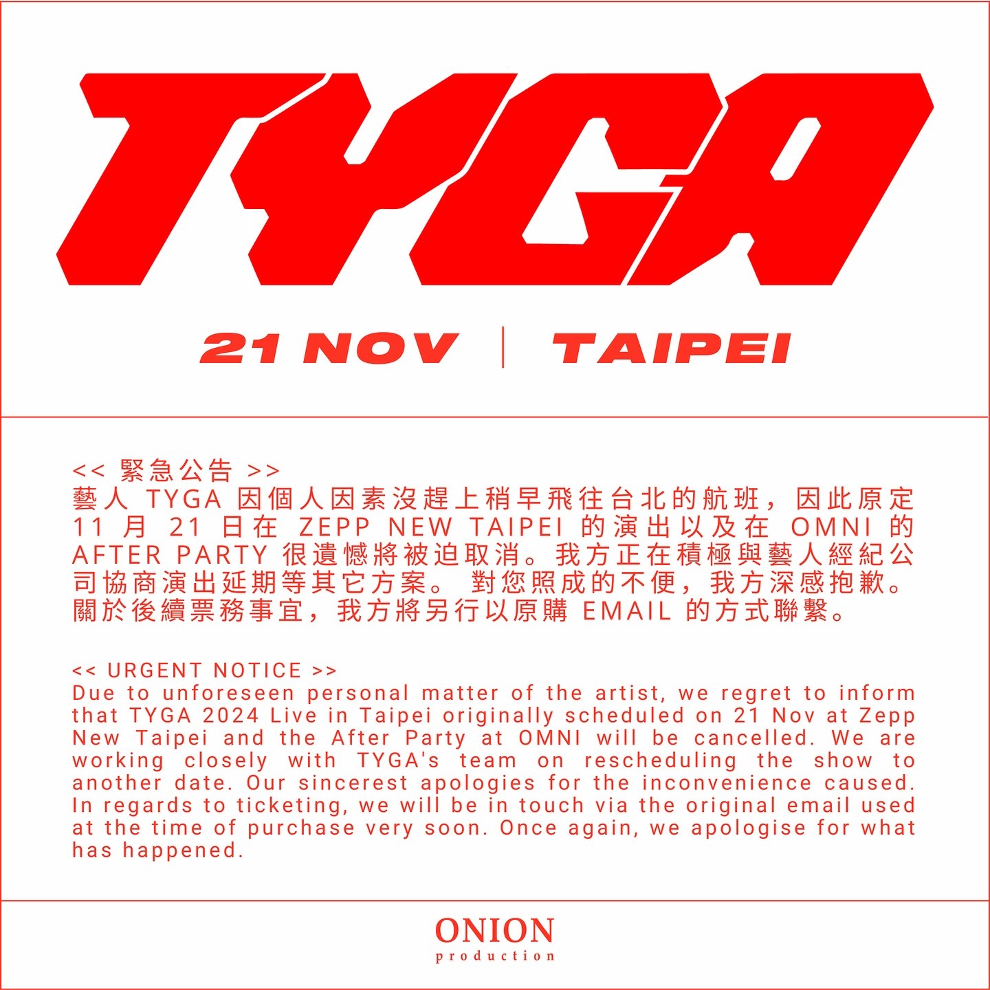 Tyga本來預計在21日晚間8點於Zepp New Taipei演出,結束表演後還會到夜店舉行After Party狂歡,因此吸引大批粉絲早早買票。沒想到演唱會主辦單位「Onion Production」今日早上發文取消演出,並透露「藝人 TYGA 因個人因素沒趕上稍早飛往台北的航班」,目前正積極與Tyga經紀公司協商演出延期等其它方案。