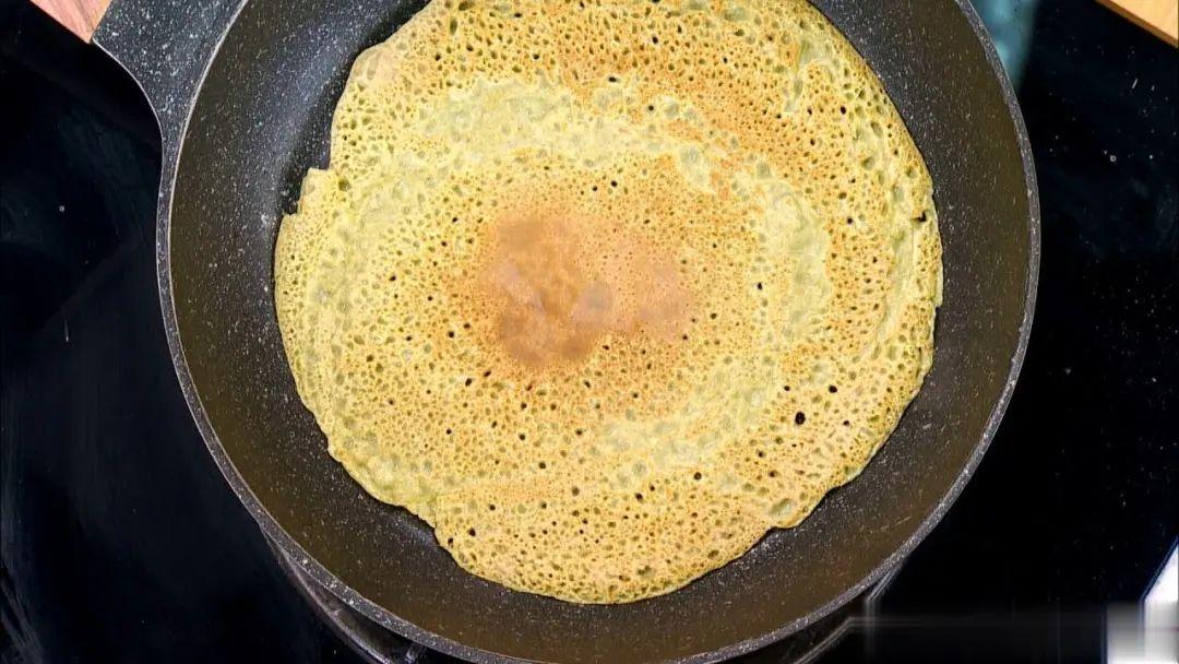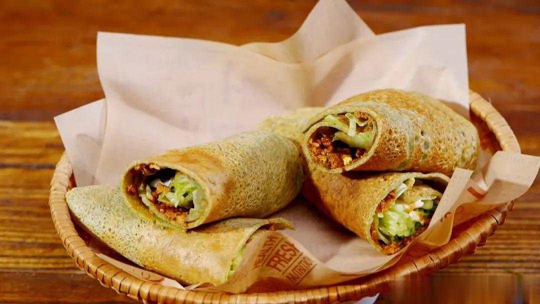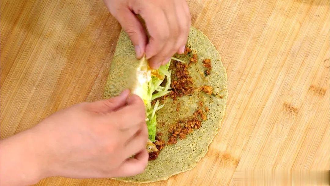 這道用綠豆做的煎餅果子,不額外添加麵粉、沒有甜麵醬,對於控糖人群更友好,美味可口。