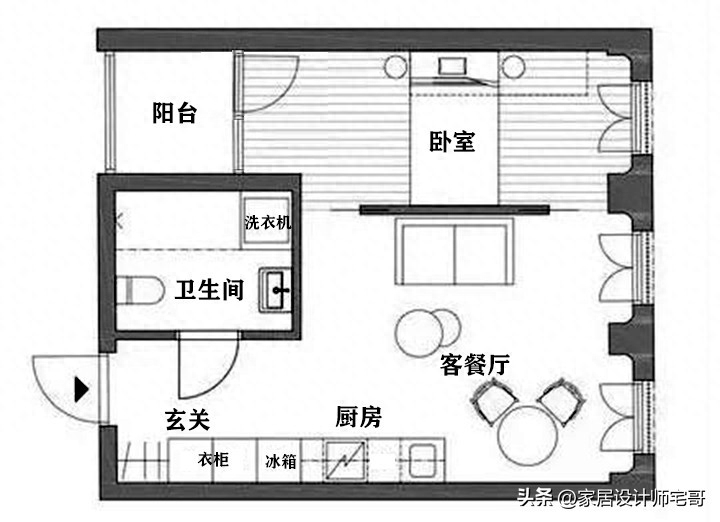 ②進門右側沿牆依次布置掛衣區、衣櫃、冰箱櫃以及開放式廚房。