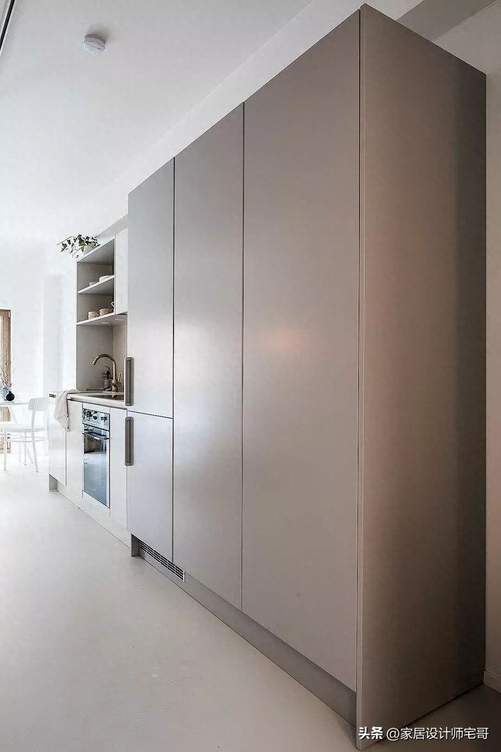 開放式的小廚房和玄關的衣櫃是做了一體化的設計,中間銜接的地方是一個冰箱櫃,裡面安裝了一台嵌入式的冰箱。