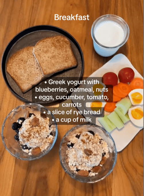 7:45 吃個營養早餐,水果蔬菜蛋白質,碳水纖維維生素樣樣齊。