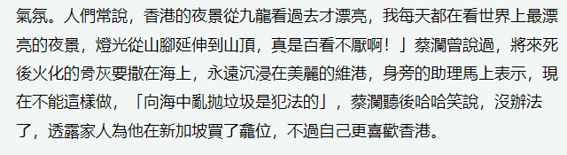 蔡瀾貴為「四大才子」,享盡榮華富貴,他說自己沒有什麼遺憾,即便有,說出來也沒人幫得到,曾想過百年之後骨灰撒入大海,但一旁的助理馬上提醒,現在不可以了,向海中亂扔垃圾事違法的。蔡瀾哈哈一笑,透露已經在新加坡買了龕位,但他更喜歡香港。