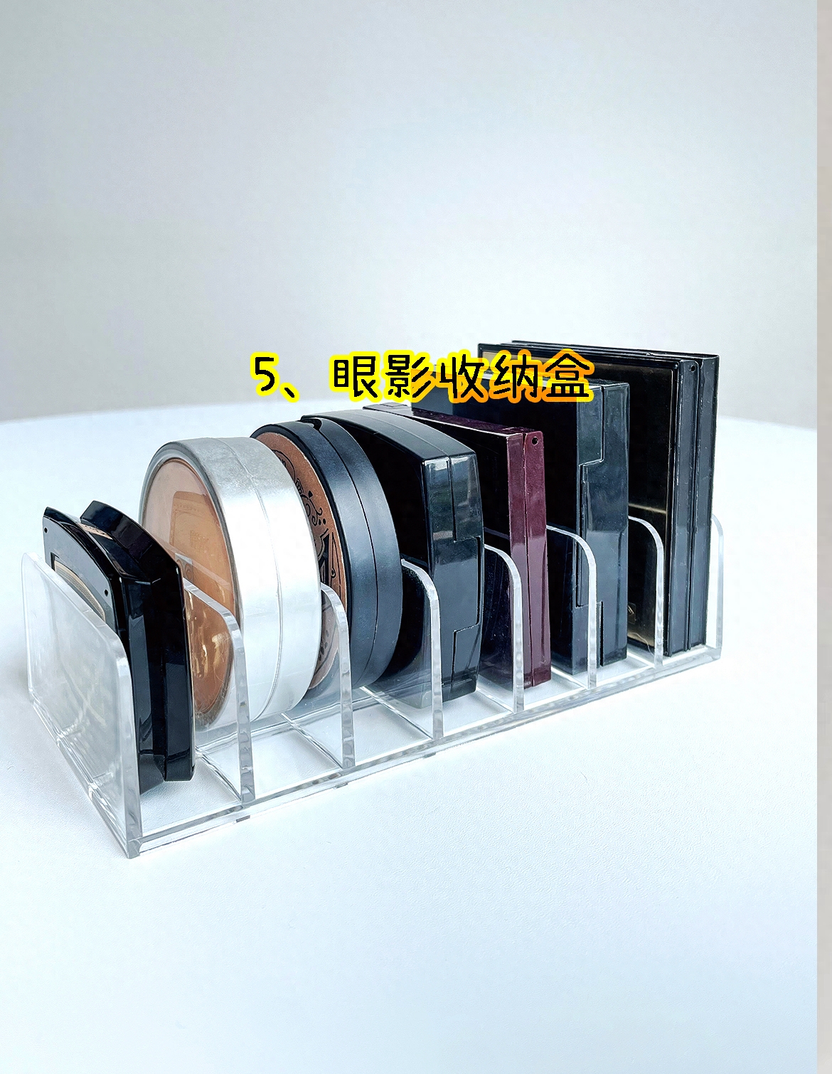 而這個透明的眼影收納盒,就可以把這些扁形的化妝品統一收納起來,亞克力材質存在感很低,所以可以讓桌面看起來更加的清爽,而且拿取的時候也方便很多。
