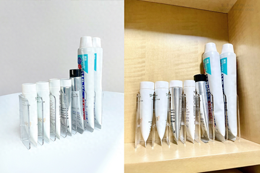 如果你把思路打開,把眼影收納盒放在衛生間用來收納像牙膏、洗面奶等管狀的東西,你會發現它的用途簡直可以直接封神。