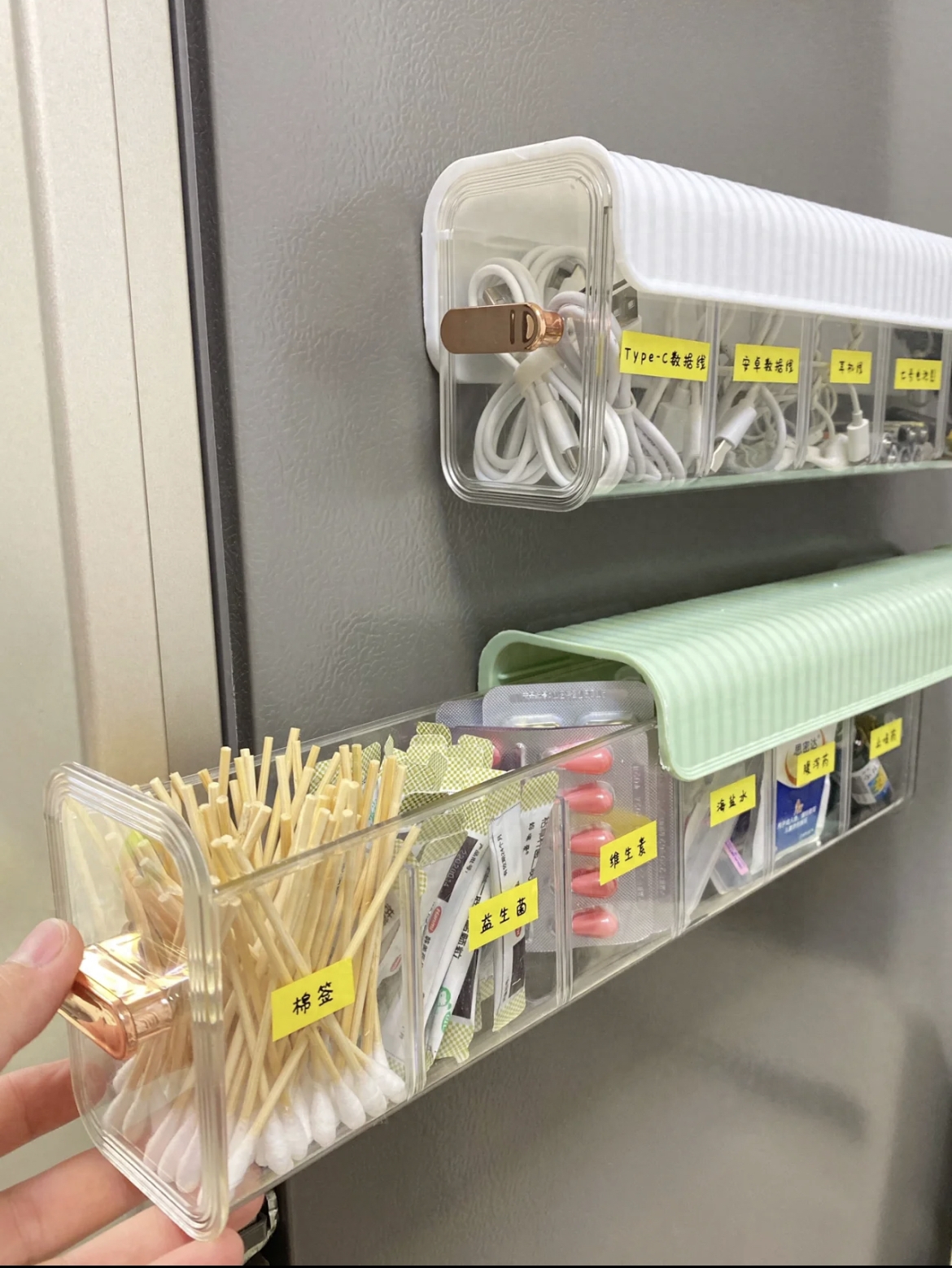 把它放在冰箱一側,用來收納寶寶日常吃的維生素、益生菌、藥品等物品,非常方便,透明的設計找東西的時候也能一目了然。