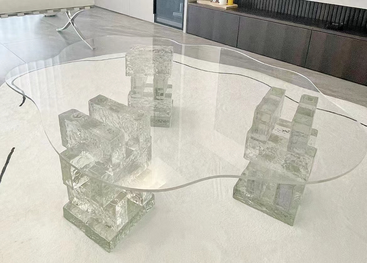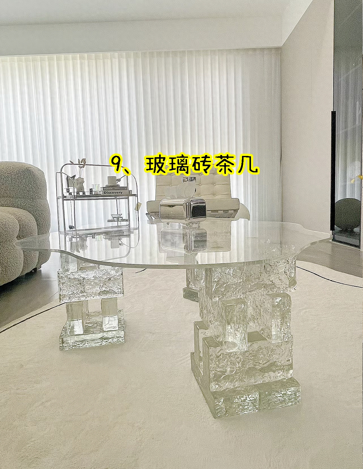 簡單的把玻璃磚用膠水粘結起來,就成一個懸浮感十足的桌腿,再搭配上一個亞克力的桌面,一個毫無存在感卻精緻感十足的茶几就誕生了。