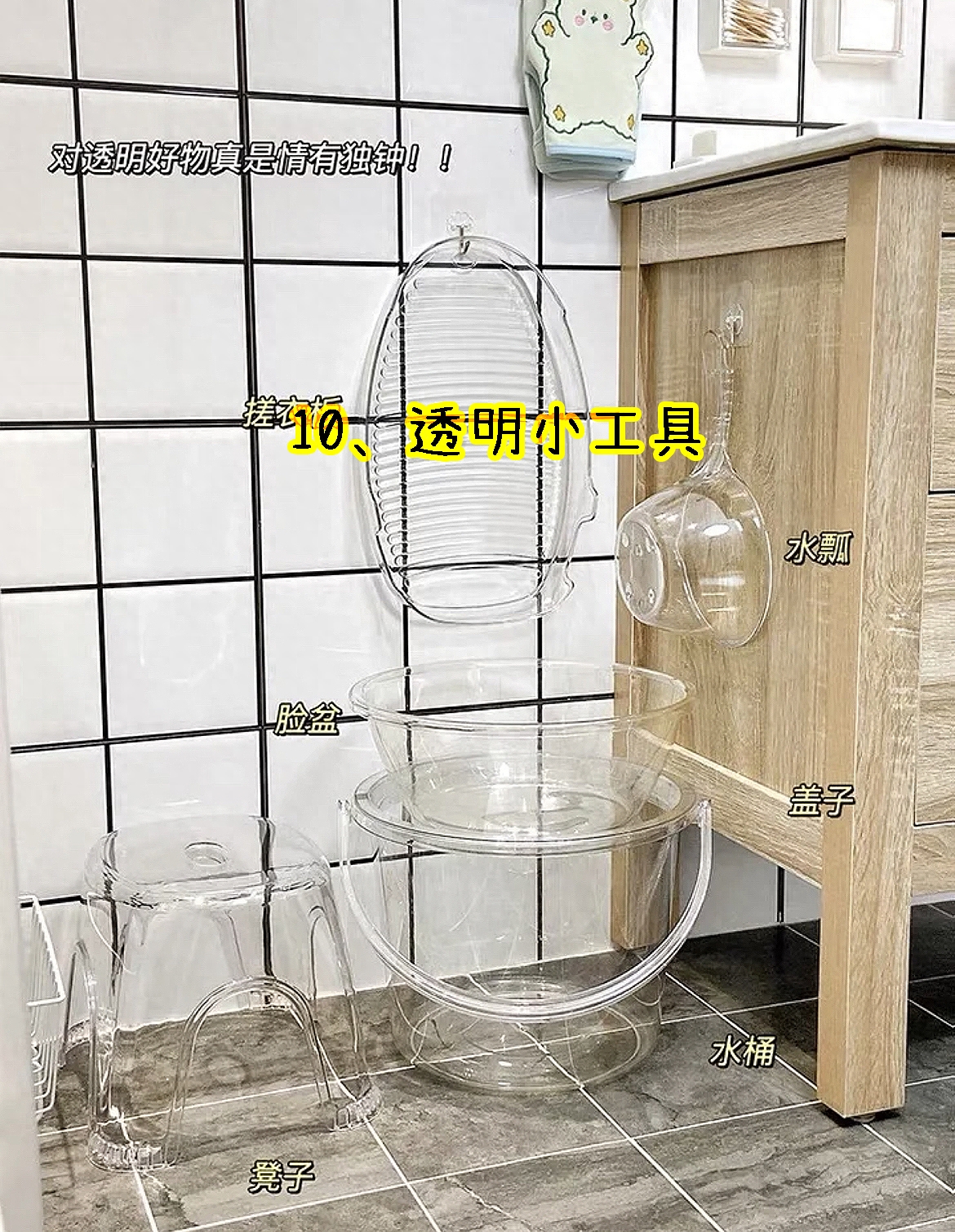 像什麼小凳子、臉盆、水桶、蓋子、水瓢、搓衣板等小物,都換成透明的產品,你會發現即使東西再多,看起來也不會那麼凌亂。