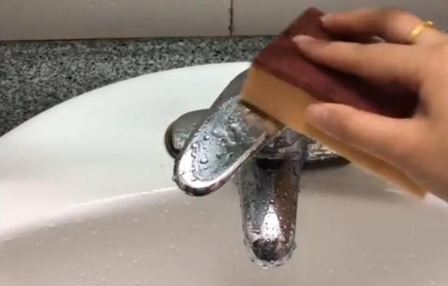 然後用百潔布進行塗抹,讓水龍頭的外表都均勻的粘上鹽水