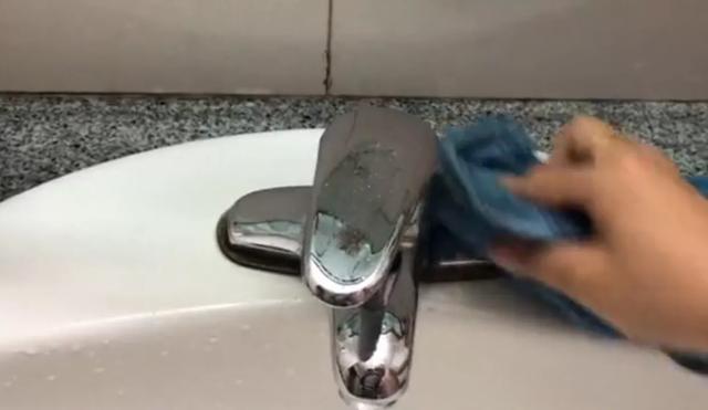 然後用抹布將水龍頭山上的水分擦乾,這樣水龍頭上的污漬就全被清除掉了,而且潔白透亮,像新的一樣