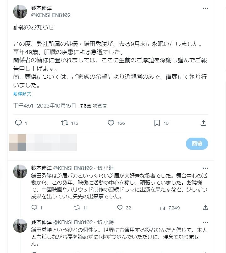 才剛嘗到走紅滋味!49歲男星驚傳「肝病過世」 經紀公司證實「遺體直接火化」 Elmo 2023-10-16 檢舉 鈴木伸洋也表示,已經協助鎌田秀勝的後事,依照親屬的要求,並沒有舉行守靈儀式或是告別式,而是直接將遺體火葬;不少演員也出面哀悼,願他一路走好,也有消息指出,他其實去年才試鏡日韓合作的喜劇片,原本正要為國際市場再開一條大路,孰料現在卻因為肝病離世,令人不勝唏噓。希望他最後沒有太痛苦...資料來源:《ETtoday》 Advertisements 回首頁 2/2 Advertisements 猜你會喜歡 生不如死!47歲女星爆逼20億富尪「去買威爾鋼」 躺床上哀嘆:「太難受了」 國道車禍!安迪女兒驚傳「遭聯結車拖行50公尺」 車身全爛「狀況曝光」 曾跟于美人搭擋!知名主持人「半夜持毒被逮」震驚演藝圈 落網才知「他曾拿下10座金鐘」:不是第一次 編輯精選推薦 More + 再婚2年了!43歲李燕突喊「當媽媽實在太辛苦」 認「已經有愛的結晶」:最完美的幸福❤️ 台語歌后慟別摯愛!告別式上認「早隱瞞病情」 道歉哭喊:原諒我簽放棄急救 離婚11年!洪榮宏愛女結婚「終破冰前妻」 「2爸爸牽她進場」催淚畫面曝 大咖男星妹妹出嫁!全身金飾「曾獲近千萬豪宅」嫁妝豐厚 兄妹長超像「一看媽媽懂了」:基因強大 台灣大咖病逝「享壽83歲」!周遊告別式痛哭「認婚內出軌」:兒子很恨我... 22歲愛女病逝!資深男星「走不出喪女痛」留白長髮現身 掛骨灰項鍊「代女做1事」惹淚 功德圓滿了!台語歌后「悲曝他離世」享壽95歲 淚喊:去當快樂的神仙吧... 以為只是小感冒!本土女星悲痛證實「他併發肺炎過世」 一度淚灑現場「後悔同意插管」 快養不起小孩!本土男星「開計程車、斜槓房仲」 突宣布「離開台灣」:演藝圈沒工作 24歲兒失明!于美人爆「他在飯店掃廁所」維生 不盼紅包只求「別再花我的錢」 本土劇女星生了!7年前凍卵「終於來到我身邊」 歌手尪嗨喊:生個足球隊 85歲失智父身亡!林葉亭突宣布「皈依佛門」 遇大師「開示一番話」忍不住淚崩 快訊/曾叱吒政壇!蔡英文「最信任的她過世」 死訊被證實「已舉辦告別式」 相差18歲!58歲康康自爆「與老婆分房12年」驚呆眾人 提到沈玉琳「坦言罹同1病」:必須警惕... 空窗多年!68歲陳美鳳突羞認「身邊有個他」 40年前就認識「遭男方母親拆散」 當年親吻1歲嬰!42年後「對方竟成巨星」同框劉德華 「超高顏值如兄弟」粉絲喊:真的差19歲? 確診甲狀腺癌!44歲男星「術後近況曝光」哽咽:她為我祈禱 「告白演員愛妻」愛不會停止 瞞病情積極工作!51歲影后「住院照曝光」眼神充滿光 丈夫悲慟「臨終前吃流食」:仍盼奇蹟降臨 趕在40歲前閃婚!八點檔女星「宣布嫁給他」 尪驚人身分曝「媒人是柯叔元」 晚年兒孫滿堂!73歲影壇大哥「拄拐杖現身」腳步蹣跚 兒子「全程攙扶不喊累」網羨:又帥又孝順 慶祝17歲愛女畢業!53歲大咖「兒女皆讀名校」年花千萬 驕傲「她獲三大獎」:又美又自信 最新/賈靜雯深夜慟曝「她已離世」 淚PO合照喊:真的好愛你... 慘遭飛車拖行!八點檔男星「臉全磨爛」驚悚畫面曝 目睹女星「崩潰嚇哭」頻發抖 模範孝子!比莉罹癌「兒白天工作、晚上睡醫院」 坦言「一滴淚沒掉」:媽媽可以我也可以 旅美多年!資深女星「堅持落葉歸根」回國5天安詳離世 死前「砸600萬做1事」眾人淚目