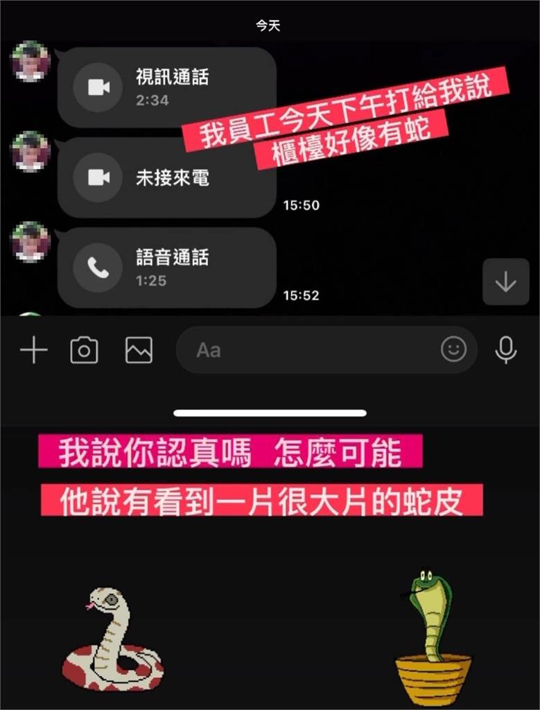 根據《民視新聞》報導,一名老闆無奈在臉書社團「爆廢公社二館」分享奇葩經歷,這天他難得休假正要出門走走,突然接到一通求救電話,員工說櫃台有蛇,聽到他問「你認真嗎?」、「怎麼可能?」時,對方還認真回答:「在櫃台下面看到很大一片蛇皮!」崩潰直呼現在不敢上班,身為老闆的他二話不說趕回店裡,路上更想出20多種抓蛇的方法,以便解決辦公室危機。