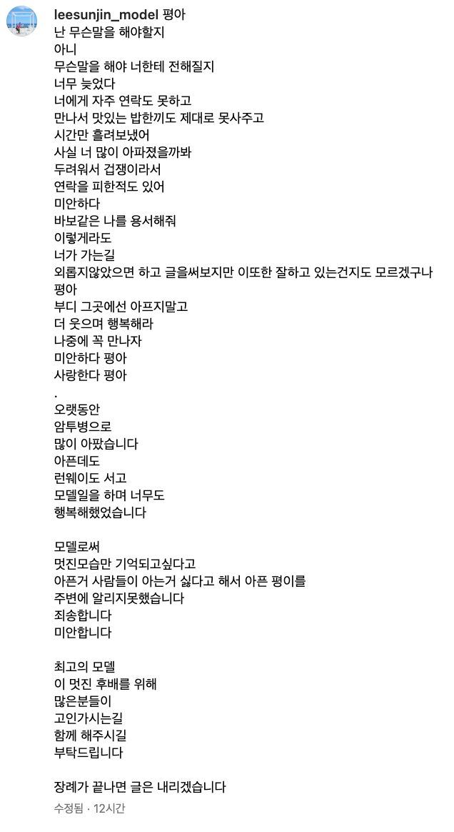 李平病逝是由演員友人李善鎮發文證實噩耗,她後悔表示自己是個膽小鬼,因為害怕看到她痛苦,錯失了很多相處時間,心痛喊話:「沒有勇氣聯絡你,也沒有為妳準備一頓豐盛的大餐,我希望妳能原諒像我這樣的笨蛋。」緊接著透露,李平在長時間的抗癌過程中,鮮少告訴周圍的人她生病,即使病得相當嚴重,仍努力地站在台上走秀,心疼表示:「在伸展台上,她感到無比的快樂,作為模特,只想被人記住她酷酷的形象!」希望留在人們記憶中,是她最光鮮亮麗的一面。