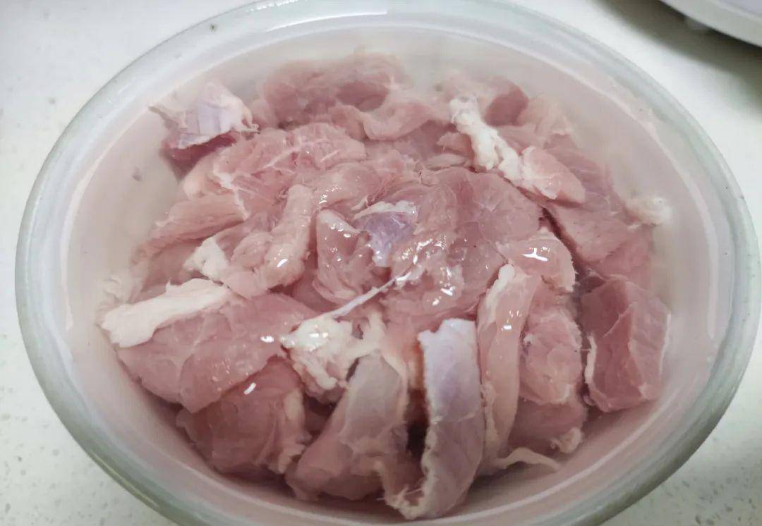 1.將備好的肉放在流動水中洗乾淨,如果表面有一些油脂要給它去掉。洗凈後放在案板上,用刀給它切成細塊,切好後的瘦肉再放清水洗凈,洗凈放一旁備用;