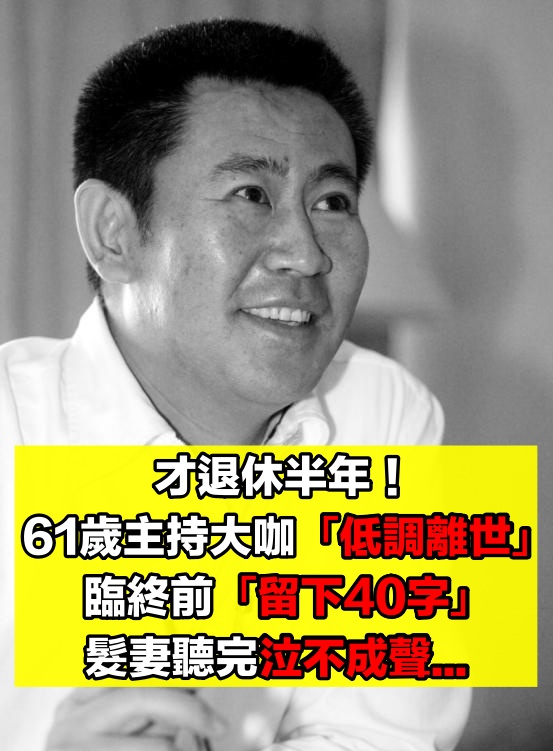 退休半年!知名主持人「默默抗癌走了」 臨終留下40字「妻子泣不成聲」:願有來生