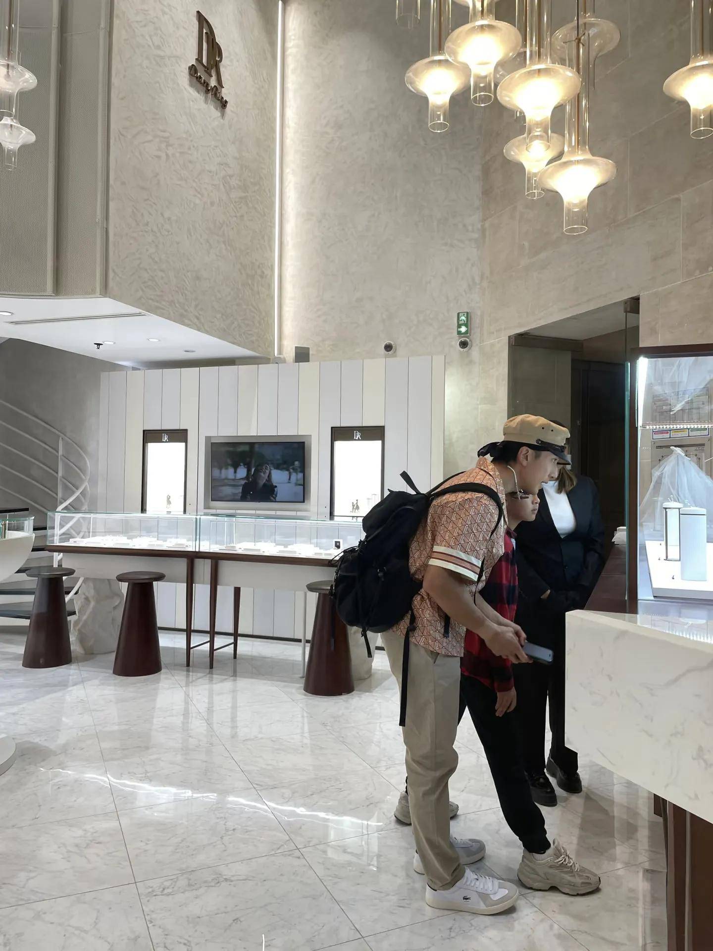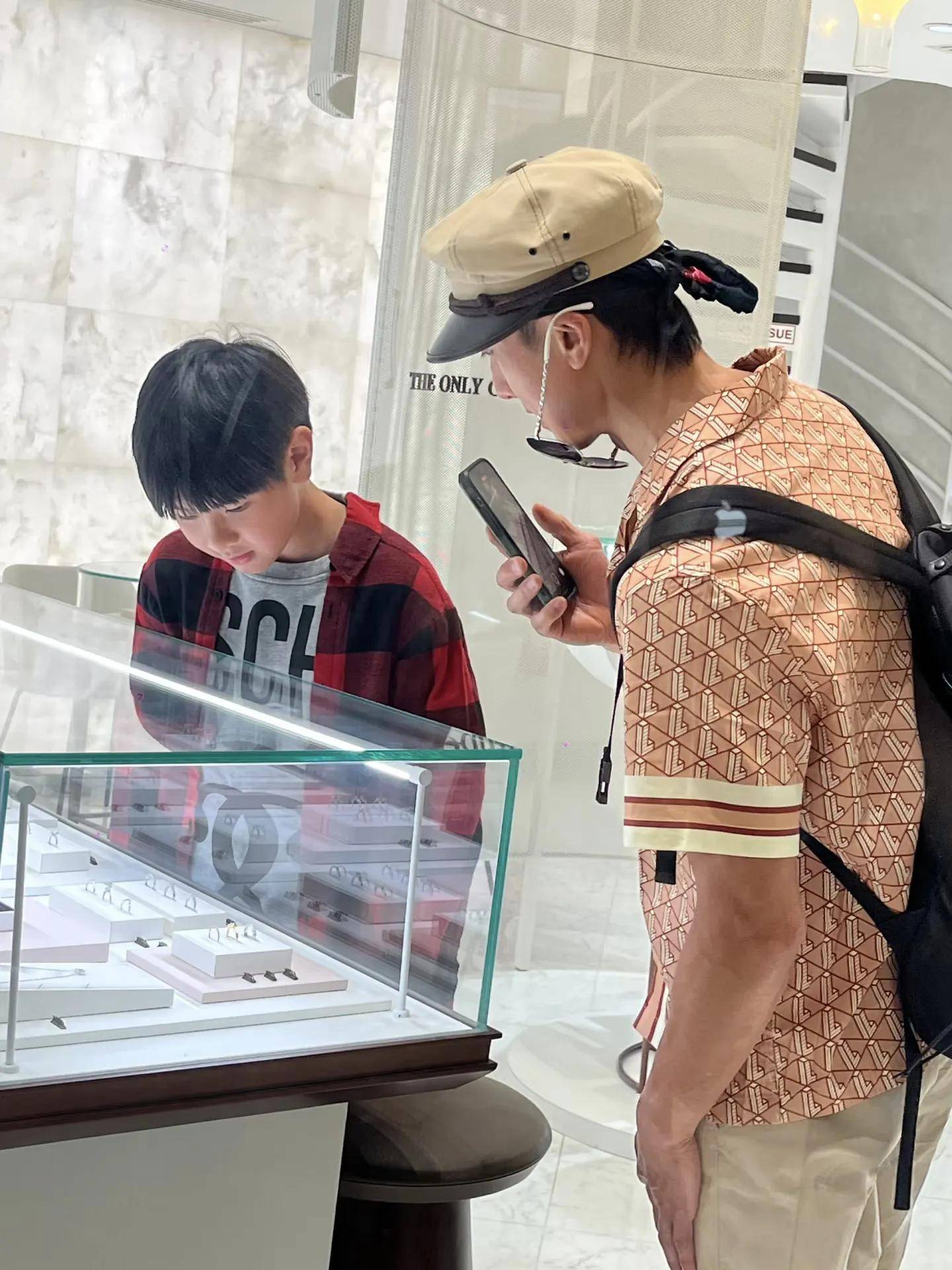 吳尊和兒子在櫃檯前看得很認真,雖然他不差錢,不用擔心價格的問題,但畢竟是要送給老婆的禮物,所以要挑選老婆喜歡的款式,並不是一件容易的事。