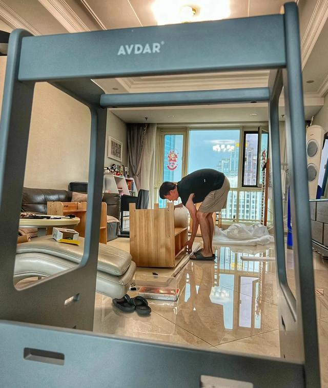 王陽在客廳裡給女兒裝架子,房子雖然不很大,還被雜物塞得滿滿當當,但很有幸福感和溫馨感。