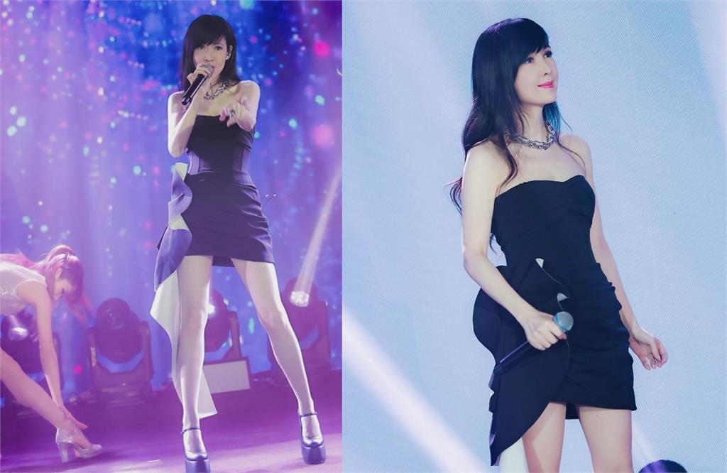畫面中可見,她身穿一件黑色平口緊身小禮服,頂著招牌黑長髮,踩著厚底高跟鞋在舞台拿著麥克風獻唱,而她一雙雪白美腿也成為畫面當中最吸睛的焦點。
