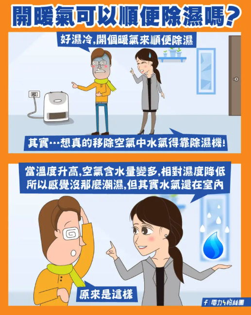 然而面對寒冷天氣,既要開暖氣又要開除濕機,難免擔心電費飆升,台電也分享兩個實用省電技巧,首先將出風口調整朝下,善用熱空氣上升、冷空氣下降的原理,可以讓暖房效果事半功倍;其次,建議搭配循環扇使用,避免熱空氣上升集中在天花板,透過循環扇、電扇、吊扇等將堆積的熱空氣散開,讓室內溫度更均勻,提升效率也能節省電費。